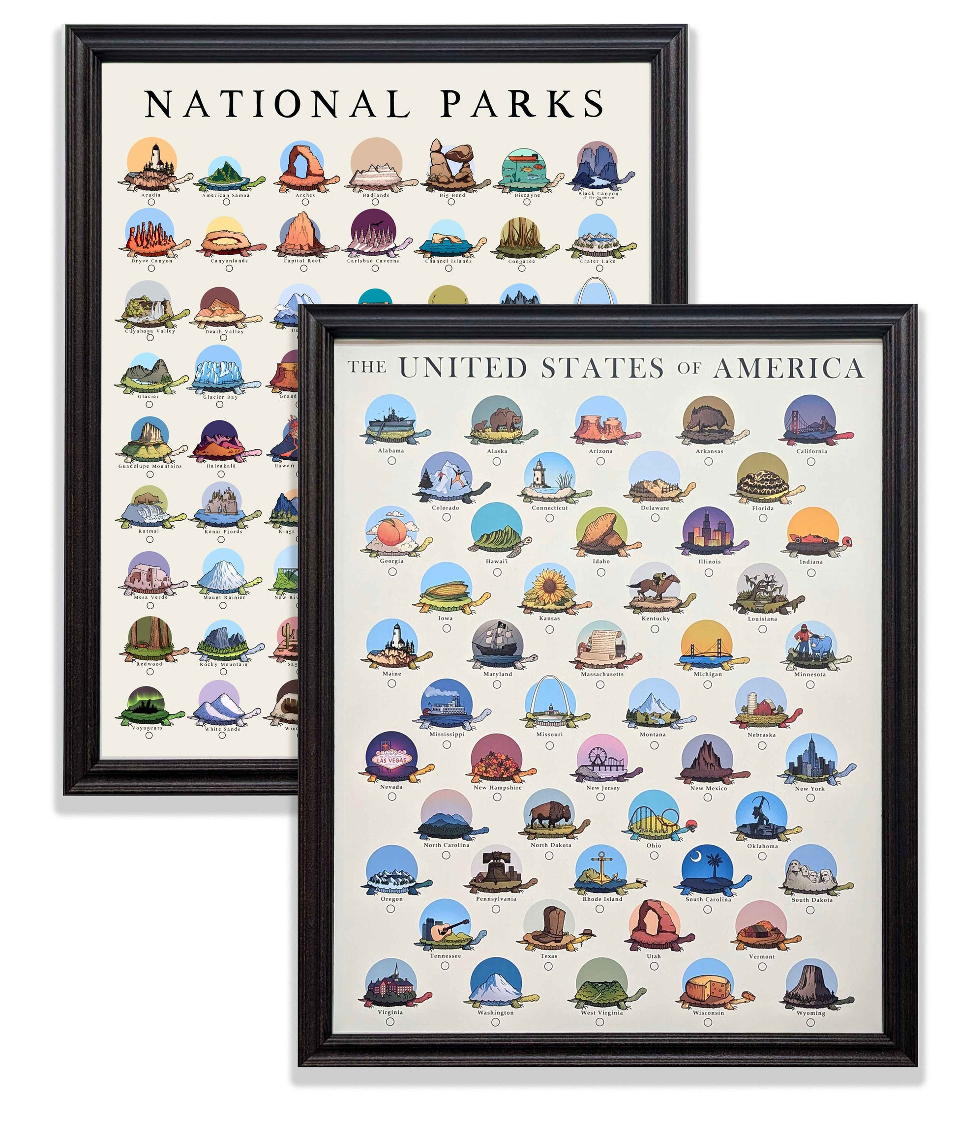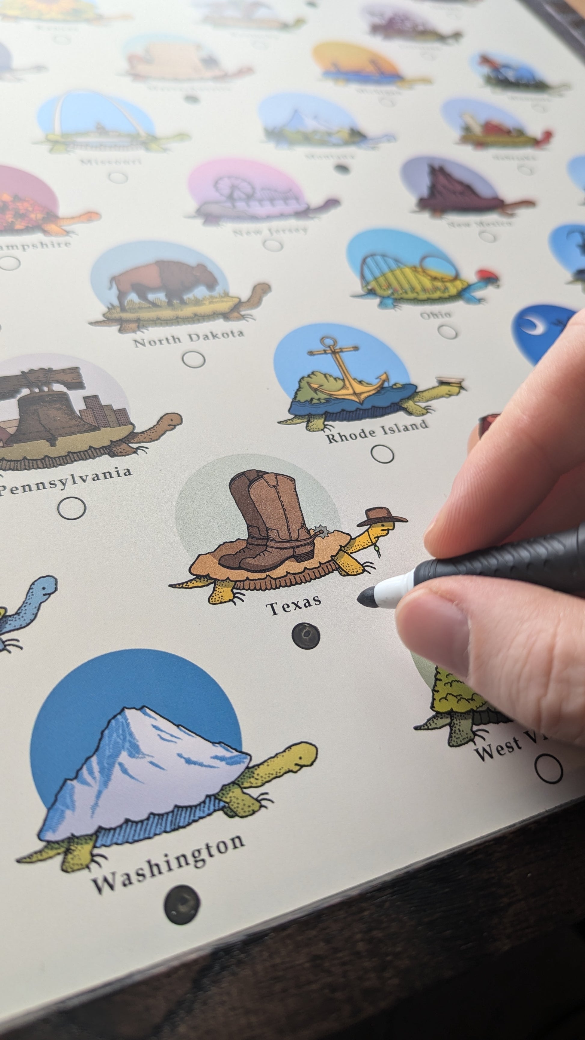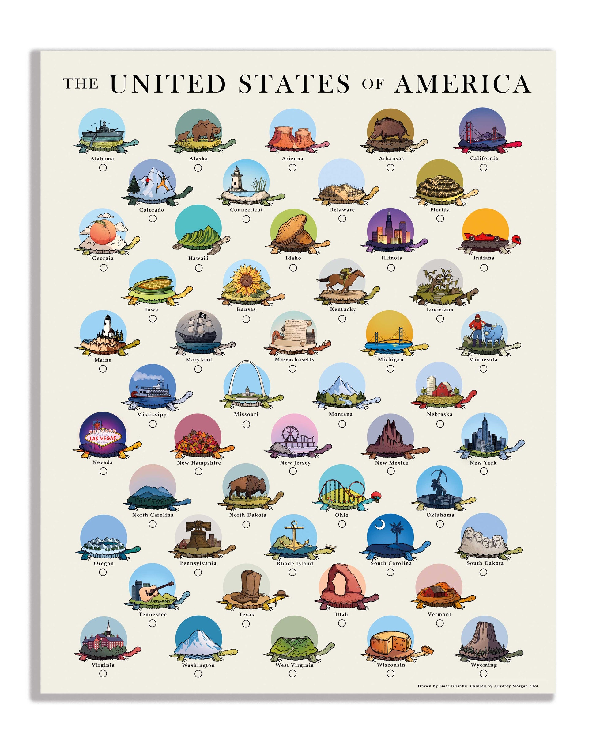 Each State was lovingly drawn on the back of a tortoise by me (Isaac Dushku) and colored by Audrey Morgan. Why a tortoise? I thought you'd never ask.
