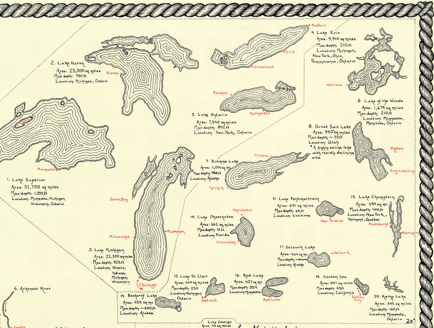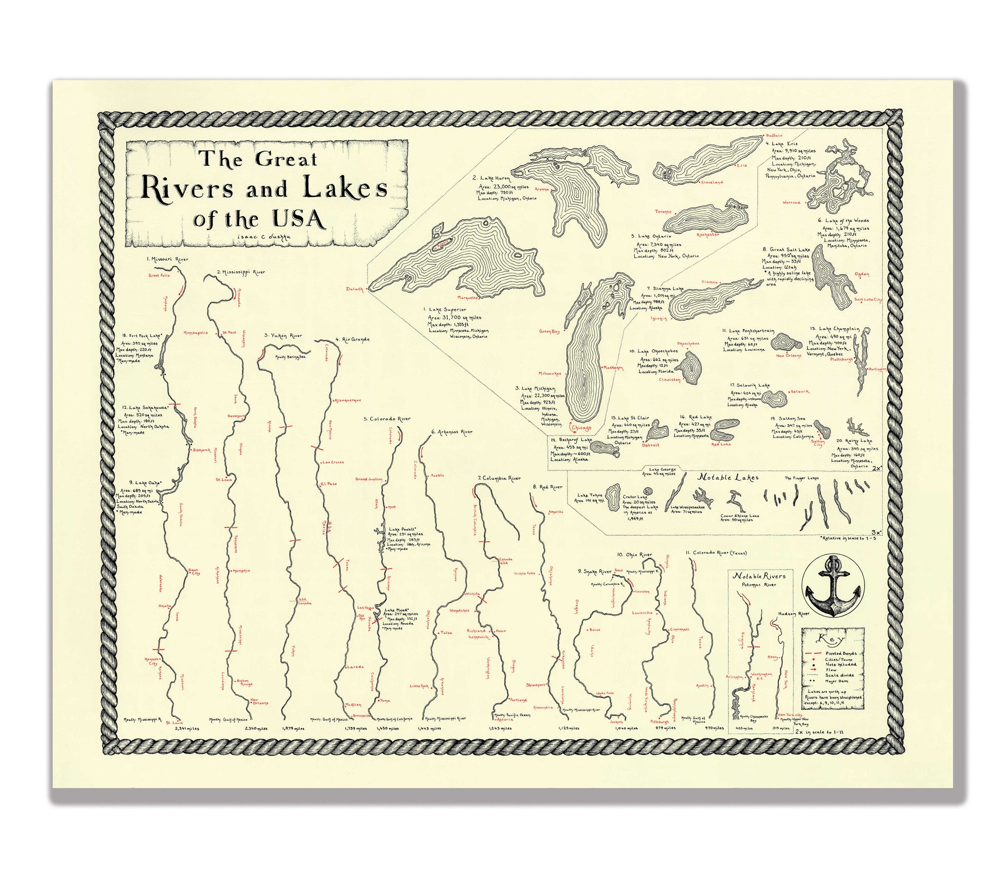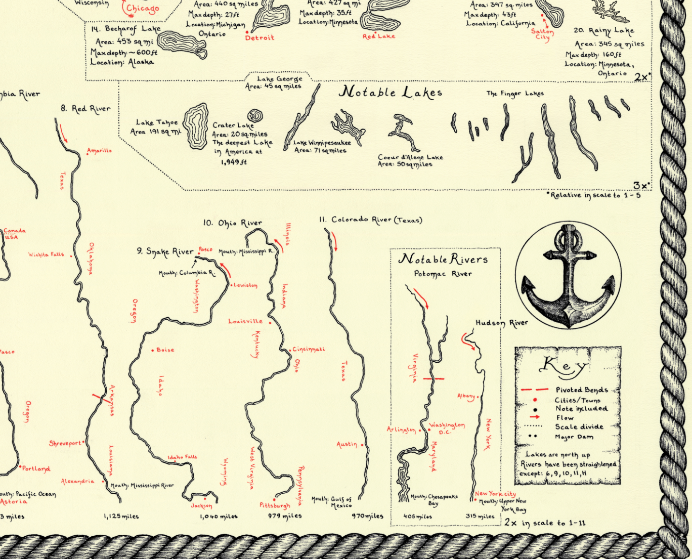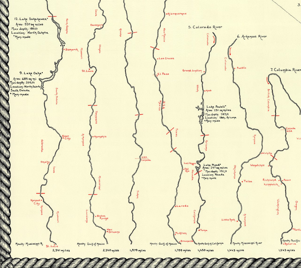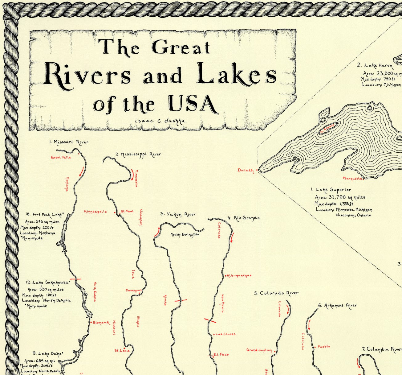 This map shows the top 11 Longest Rivers in the US and the top 20 Largest Lakes by area. I included some "honorable mention" rivers and lakes such as the Hudson River, Lake Tahoe, Lake George and others.