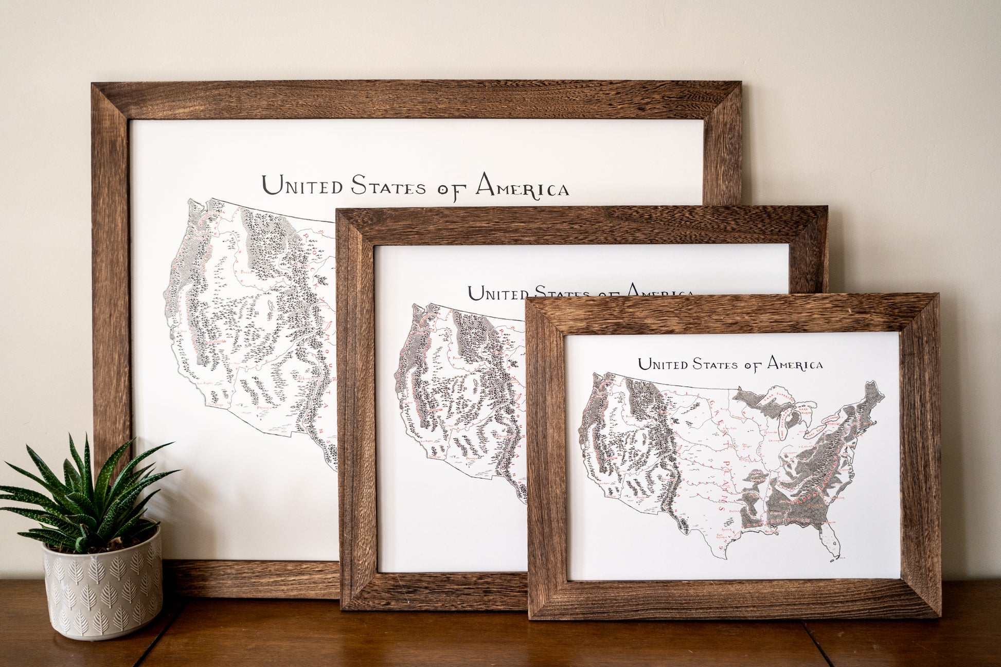 Note from the Artist: Personally, I prefer to hang my art without any sort of glass insert. While the glass prevents damage, I think it introduces a glare that I want to avoid. Without glass, you can take pictures of your map in direct sunlight glare free!